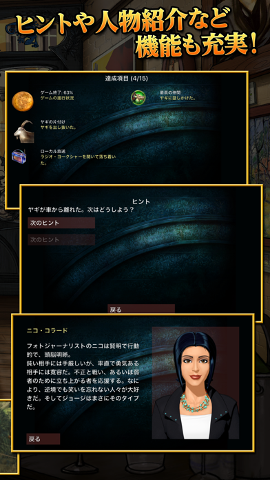 グラフィックがとても繊細で、荒れた屋敷や草原などの背景が美しく描かれています。人物はアニメーションで動き、フルボイス。推理映画のようなクオリティに圧倒されます。パズルや暗号といった謎解きも多く、やりこみ甲斐もバッチリですよ。