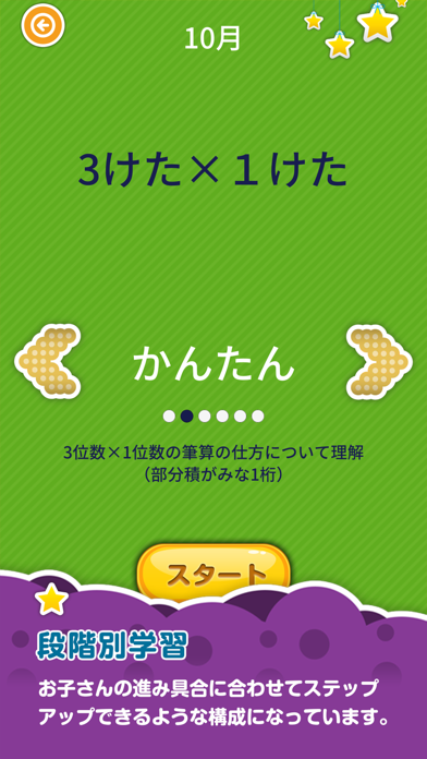 小学3年生で学ぶ算数を学習できるアプリです。わり算、かけ算を中心に、子供の学力に合わせた難易度の問題に取り組めます。