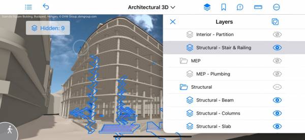 BIMxファイルを読み込み、建築物を3Dで閲覧できます。階層ごとに細かく見られるので、自分の建築デザインを人に見せたいときに使えるでしょう。ズームアップすれば、建物内の視点でも閲覧可能。画面左下のアイコンから、間取り図を表示させることもできますよ。