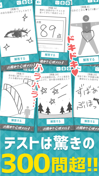 お絵かきで本性を暴く、心理テストアプリです。「丸を描いてみて」→「丸が大きいほど心の余裕があります」といったふうに、一問一答形式であなたの心理を教えてくれますよ。300問以上のボリュームがあるので、飽きずに楽しめるでしょう。