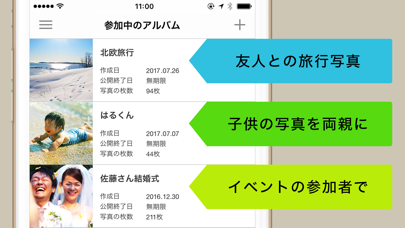 写真をシェアできるアプリ。イベント毎に別の人を招待できるので便利です。webサイトと繋がってるのでパソコンとも共有できると思います。