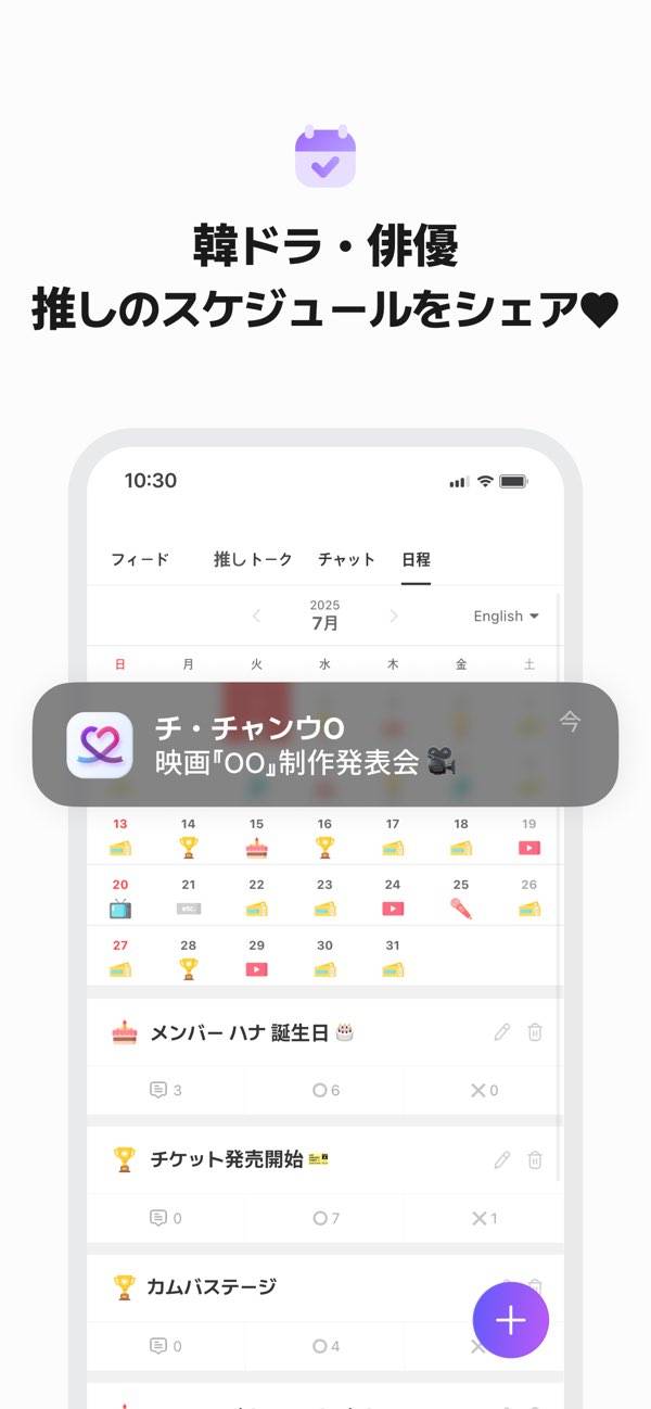 応援しているスターのスケジュールを、アプリに登録できます。テレビの出演予定や新曲の発売日をチェックして、通知を設定可能。推しのスケジュールがひと目でわかるので便利でしょう。