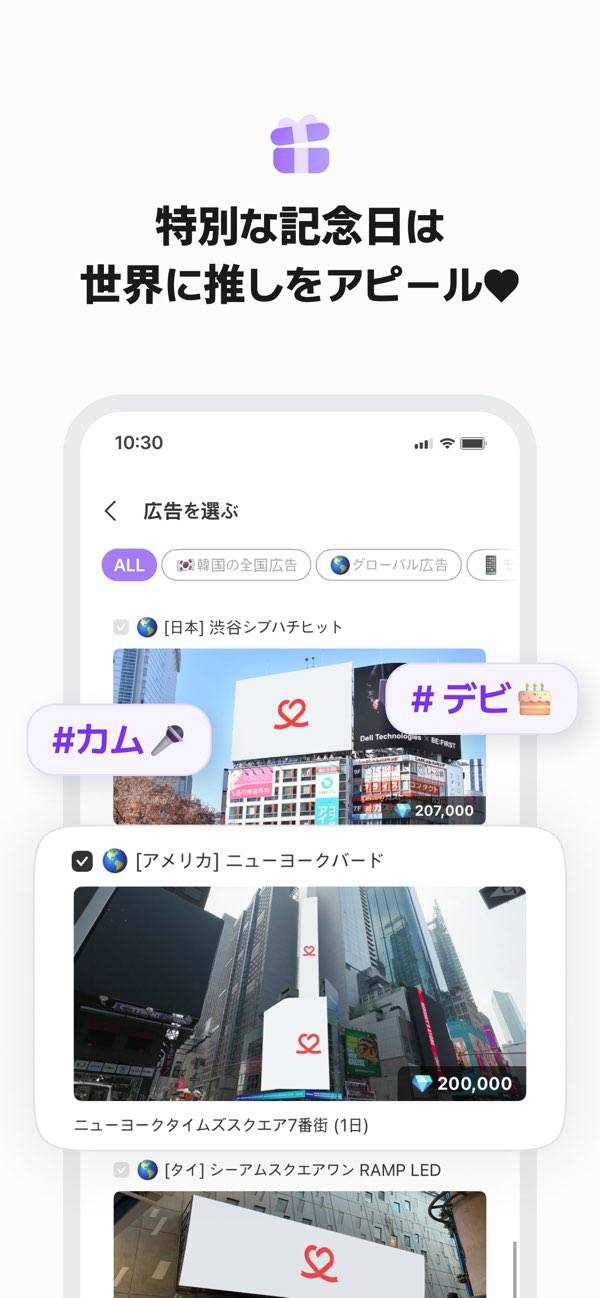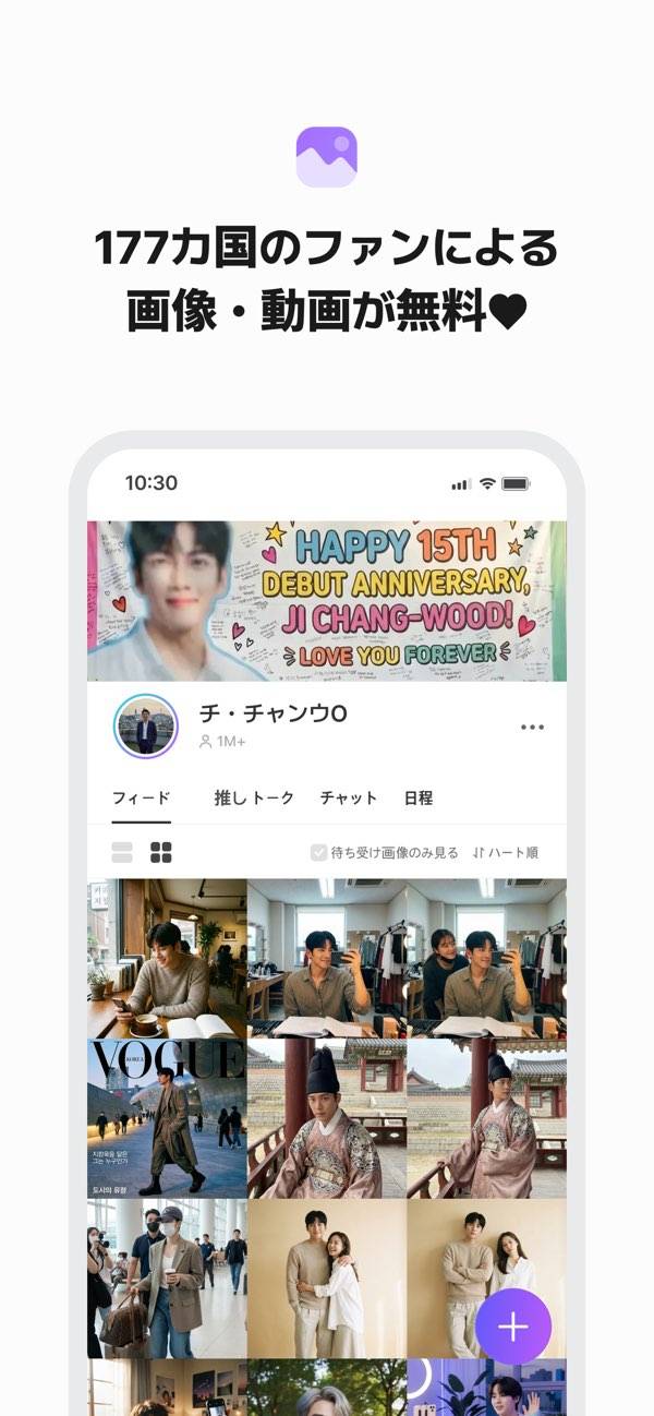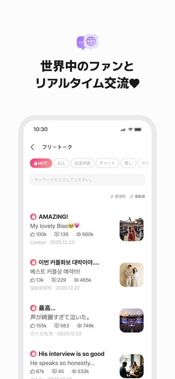 ハートを使って推しの韓流スターを応援できるアプリです。ハートを多く集めたスターは殿堂入りに表示されます。応援の気持ちを伝えて、推しのスターのランキングを上げましょう。