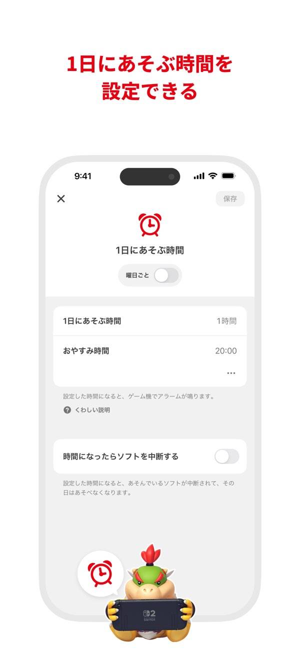 「Nintendo Switch」で遊ぶお子さまがいる保護者向けのアプリ!プレイ時間や年齢に合わないソフトなどを制限できます。次世代って感じがしてすごいですね・・。これがあればいつでもどこでも見守れます。ゲームが勝手に消えるかアラームが鳴るかなどの細かい設定もOK!