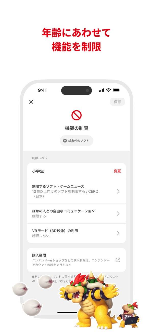 遊びすぎていたらアプリでゲームを中断させたり、対象年齢に合わないゲームは起動できなくなったり、子どもが楽しく安全にプレイできるよう見守ることができますよ。