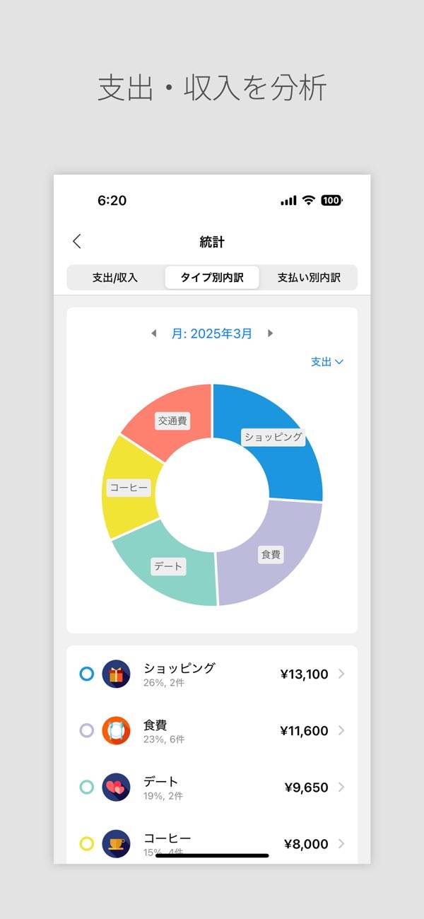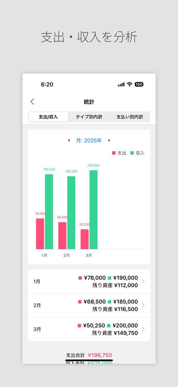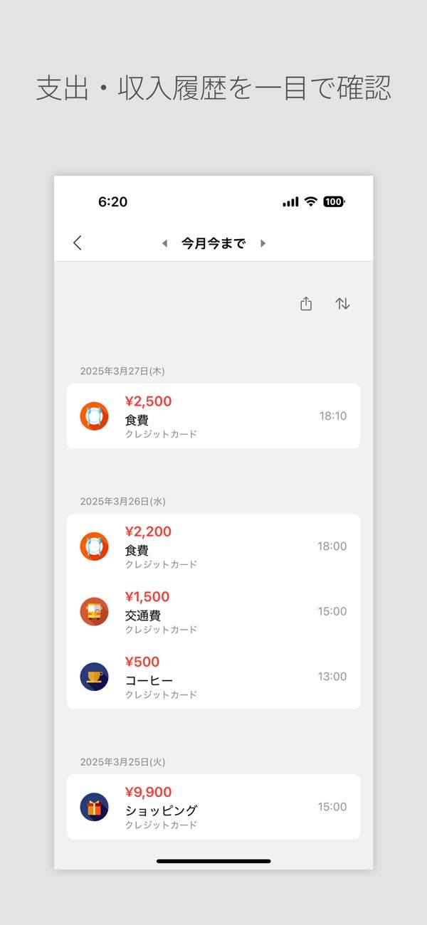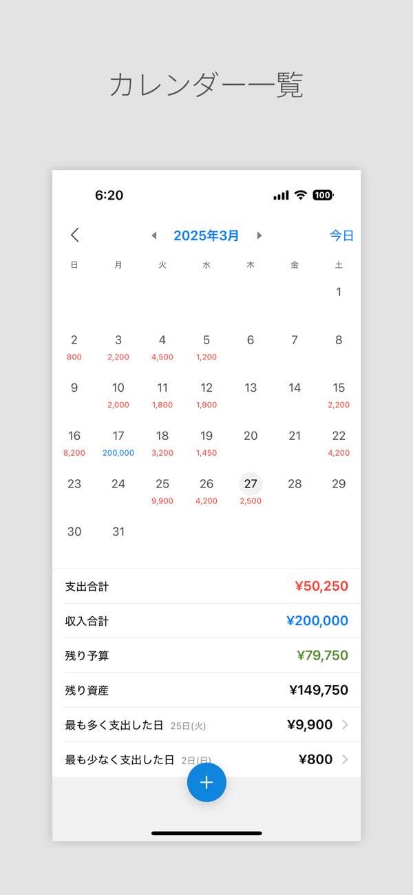 このアプリでは、収支をカレンダー表示で確認可能。月別の支出・収入の統合内訳と毎日の支出・収入内訳をひと目で確認できます。これにより、将来的な金銭計画を立てる際の参考にもなるでしょう。
