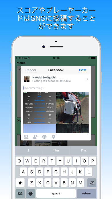 試合のスコアを見て、サーブの成功率や自分の腕を詳しく見られます。またSNSへの投稿や画像としての共有も可能。コーチや仲間との情報共有がスムーズになり、弱点の改善や今後の方針なども考えやすくなるでしょう。