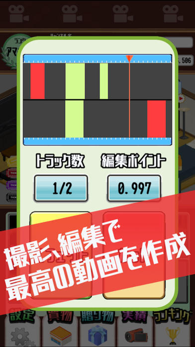 時間が経って動画が完成したら、編集でポイントを伸ばしましょう。タイミングよく「エフェクト」「カット」を長押しし、最終的なポイントの倍率を上げます。また稀に手に入る贈り物で動画の各ステータスをUP可能。メリハリあるゲーム性で進行を楽しめます。