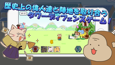 人気アニメ『ねこねこ日本史』のねこたちが戦う、横スクロール型のタワーディフェンスゲーム。日本史に登場する偉人たちがねこキャラになり、キュートなバトルを見せてくれます。