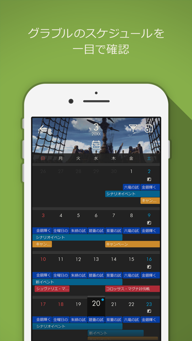 スマホRPG「グランブルーファンタジー」を、より便利にしてくれるカレンダー。ゲームのスケジュールをひと目で確認できます。