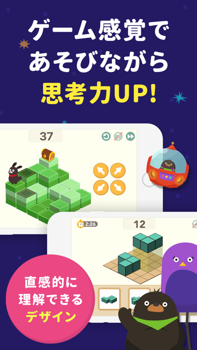 図形やパズル、迷路を使ったミニゲームに挑戦しながら、子供の思考力を伸ばせる知育アプリ。問題は3分ほどで終わるものばかりで、1日10分のスキマ時間で取り組めます。映像や動きで考え方が自然と身につくので、ゲーム感覚で楽しく学べますよ。