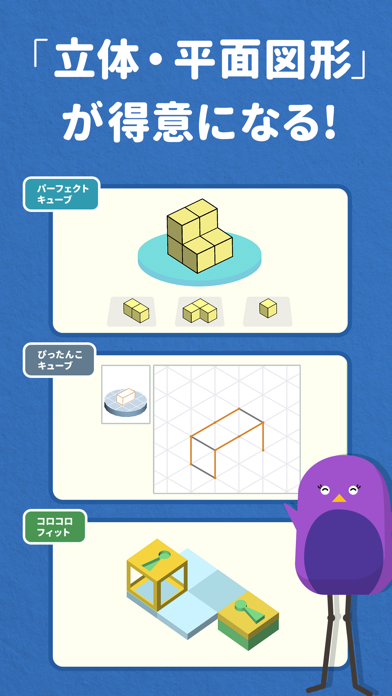 図形が画面上で実際に組み立てられる動きを見ることができるので、空間や展開の感覚がつかみやすくなっています。折り紙を折るような感覚で立体が形作られるため、初めて見る問題でも感覚的に理解できます。小学校で習う図形問題への土台作りとしても役立ちますよ。