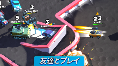 1分ほどの隙間時間でちょこっと遊べる、でも何十分でも遊びたくなる車のバトルゲームです。操作は極めてシンプルで、画面の左右をタップしてハンドルを切るだけ。あとは自動で進むので、ステージ上の武器を獲得して他ユーザーの車を破壊しつつ、王冠を集めていきます。
