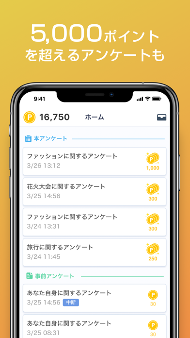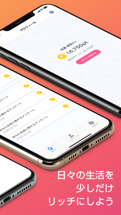 通常のアンケートでもポイントが貯まりますし、インタビューアンケートもリアルタイムで通知が来ていくつかの質問にチャット形式で応えて自分が条件に当てはまれば採用されて本アンケートに参加できます。まだ本アンケートに参加したことはないですがなんだかワクワクするアプリです。