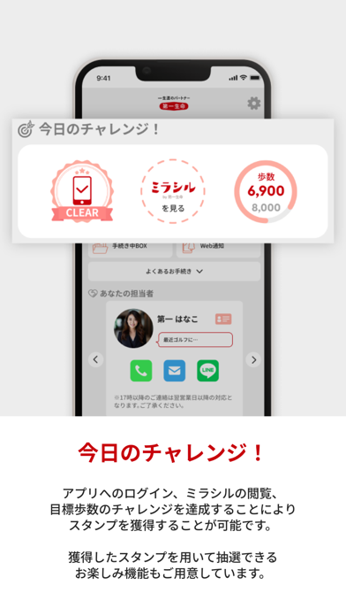 - 歩数計連携で健康習慣を形成。スタンプを貯めて報酬ゲットのチャンス