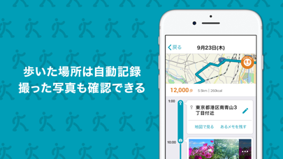 端末を持ち歩くだけで歩数や行った場所、消費カロリー、歩いた距離を自動的に記録。また、体重も記録でき、タイムラインやグラフで振り返ることが可能です。これにより、健康活動を見直し、計画的にウォーキングを行えます。