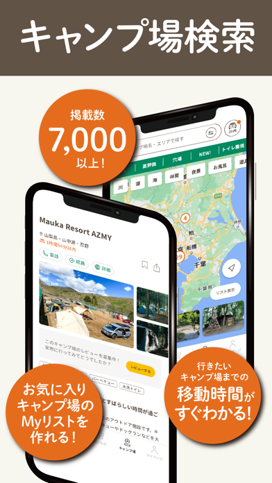 - 全国7,000以上のキャンプ場を現在地からの移動時間で簡単検索