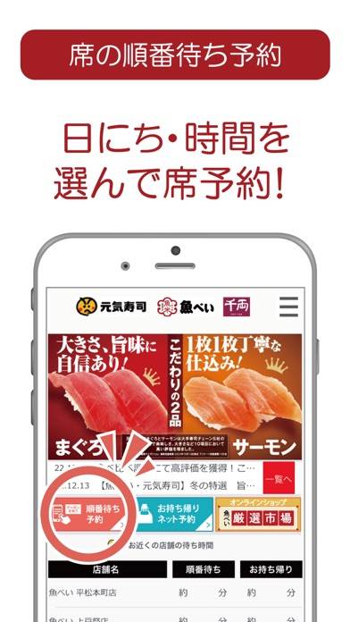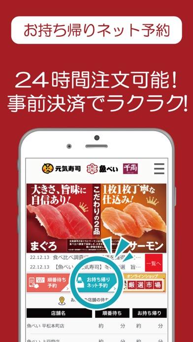寿司チェーン店「元気寿司」「魚べい」「千両」の予約ができる公式アプリ。アプリ限定のクーポン・キャンペーンなどの情報を配信しています。お気に入りのお店を登録しておけば、そのお店の順番待ち予約が利用可能に。待ち時間が短縮したい人におすすめです。