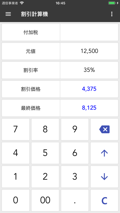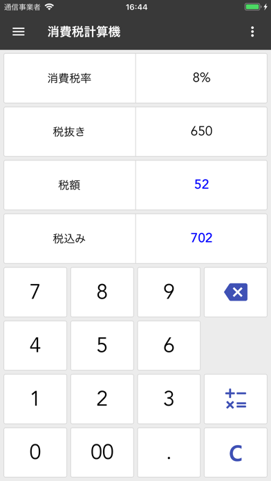 基本の電卓画面は、大きくて見やすいボタンと色分けされたレイアウトが特長。標準的な四則演算はもちろん、8%・10%の税率に対応した税込価格の確認もワンタップでできます。履歴も残るので、あとで金額を見返すのも簡単。ちょっとした計算もサッと済ませられます。