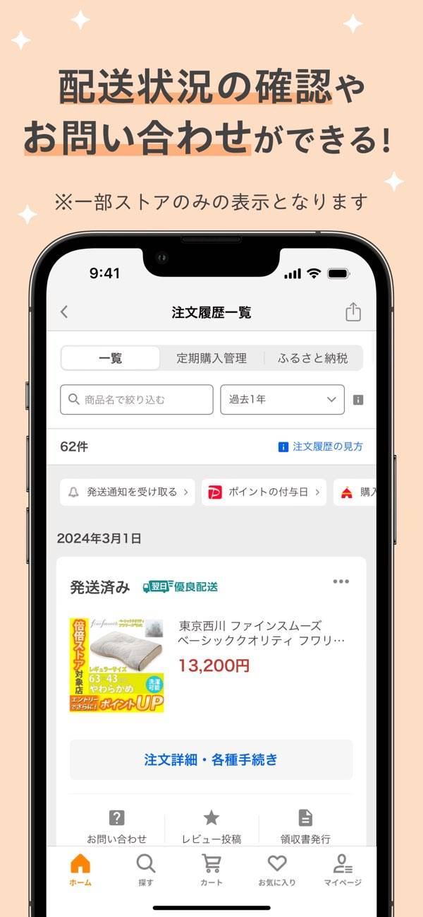 商品を探すのに便利なウィジェットや、発送通知などのプッシュ機能が充実。検索履歴やおすすめ表示で、関連する商品もどんどん見つけやすくなります。荷物の状況もひと目でわかるので、通販にありがちな「いつ届く?」の不安もありません。