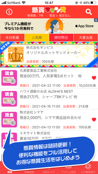 - 常に更新される、1,500件以上の懸賞情報。ほしい商品が見つかる