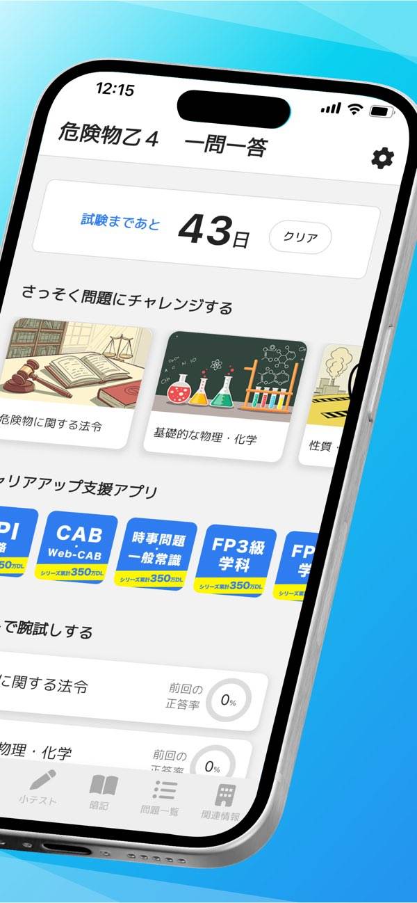 国家資格「乙種第4類危険物取扱者」取得を目指す方に最適なアプリ。問題、小テスト、暗記の3モードで効率的に勉強できます。学習進捗を見える化し、苦手な問題を集中的に攻略できる進捗管理機能も特徴です。