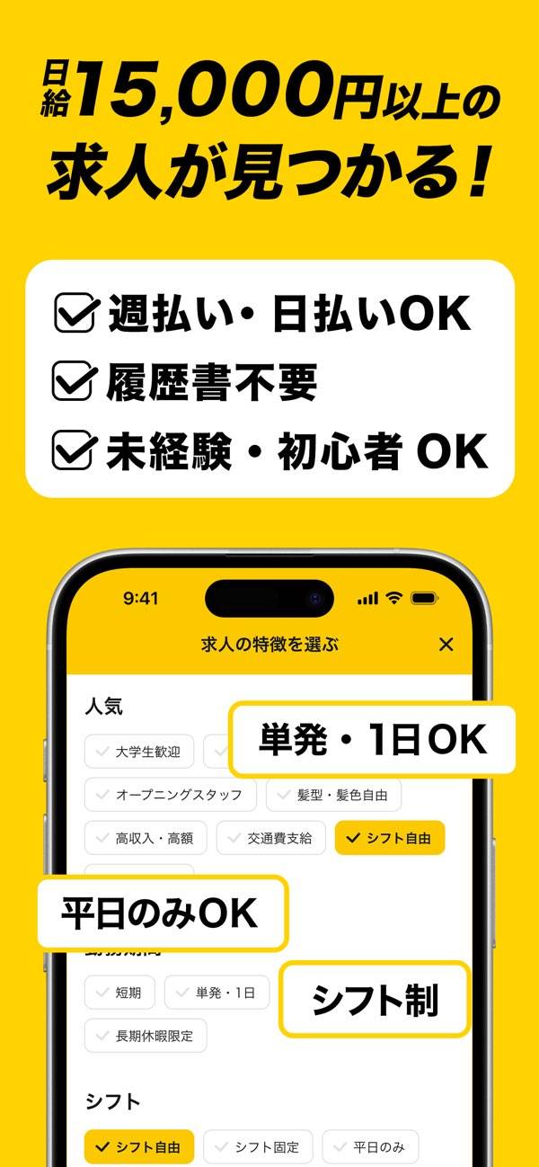 求人情報サイト「タウンワーク」のアプリ版です。短期・単発バイトを含め、パートや契約社員などの働き方を指定できます。また「週1OK」「学生歓迎」などの、絞り込み検索をしやすいのが特徴。