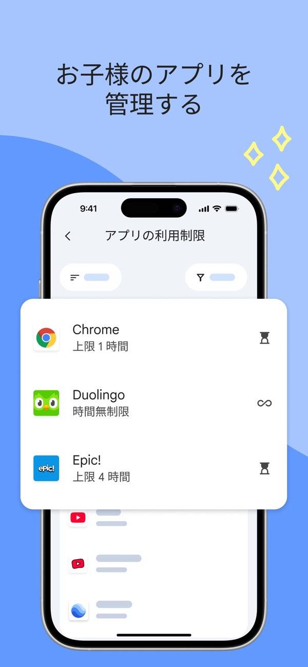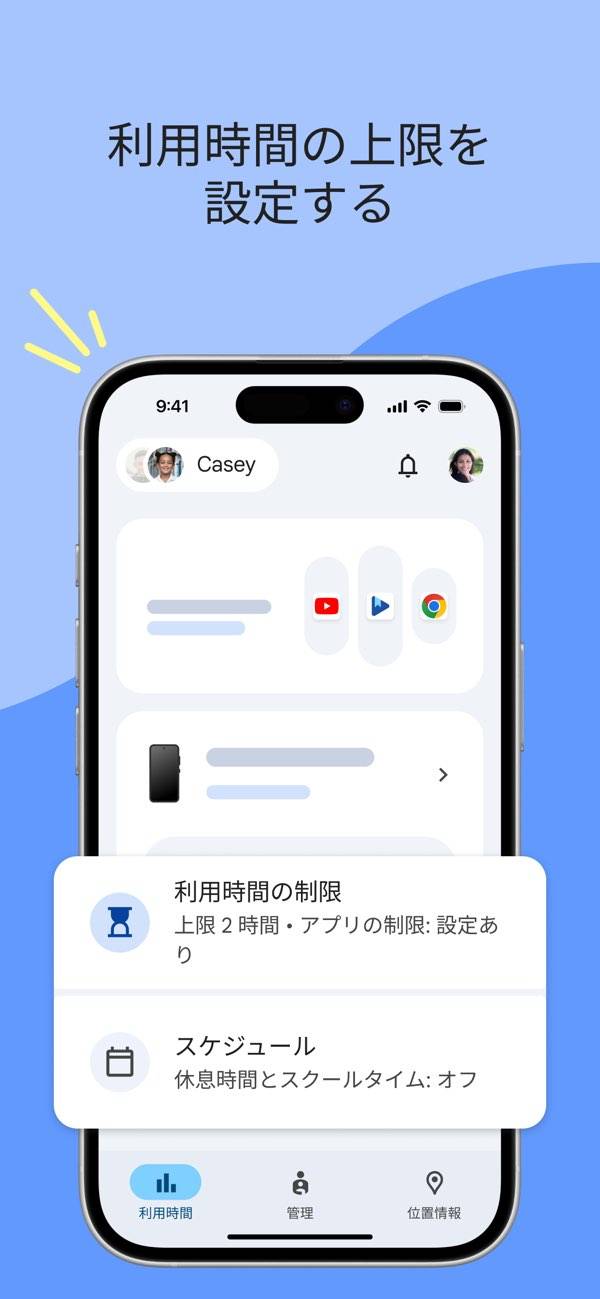 - 保護者の端末から子供のスマホを管理。利用時間の上限を設定可能