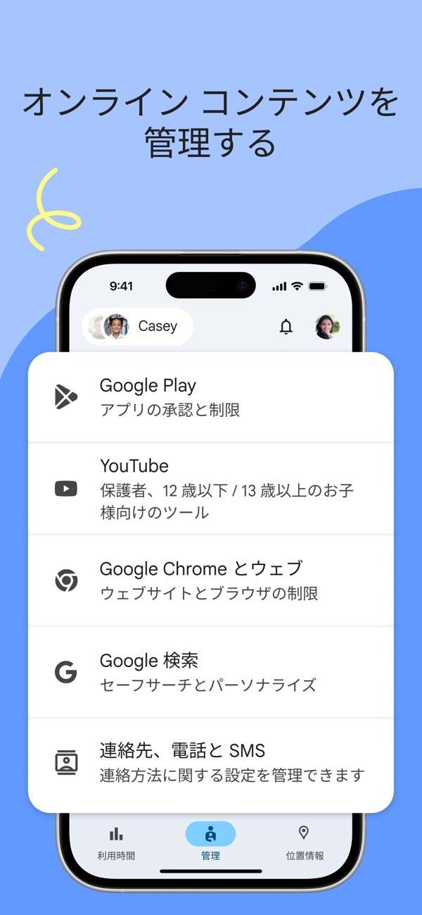 13歳未満の子供のGoogle アカウントを作成し、管理できるアプリです。子供がスマホを使う時間に制限をかけられるので、スマホ依存の防止になります。また使用するアプリの承認設定や、危険サイトのブロックが可能。位置情報の共有機能もついており、小学生の子供がいる保護者におすすめです。