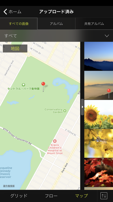 写真を、3つのビュー(グリッド/フロー/マップ)で切り替えて見ることが可能。グリッドビューは一覧性が高く、フローはスライドするだけで大量の写真を一覧できます。また、マップビューは写真とその撮影場所を一緒に確認できます。