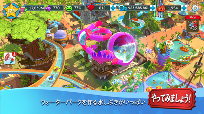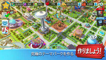 アトラクションやショップを設置し、遊園地を経営していきます。アトラクションなどはプレイヤーレベルが上がると、増えていく仕組み。画面上部には顧客満足度が表示されており、なにを建設したらいいのかわからないときは、参考にしてみるといいでしょう。