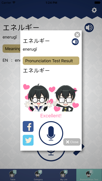 ▲テストでは自分の声を録音して発音練習が可能。矢印を押すと次のカタカナが選出される。