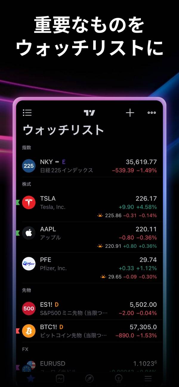 さまざまな金融商品のチャートをリアルタイムで確認できるアプリ。自分が見たい株式や通貨ペアだけをウォッチリストで選べるため、欲しい情報に瞬時にアクセスできます。描画ツールやテクニカル指標を駆使して、株式や暗号資産の詳細な分析が可能です。