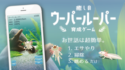 本アプリは、ウーパールーパーの育成ゲーム。と言っても何も難しい事はなく、4日に1回の餌やりと1週間に1回の掃除を忘れなければOK。一生懸命に泳ぐウーパールーパーに癒されます。