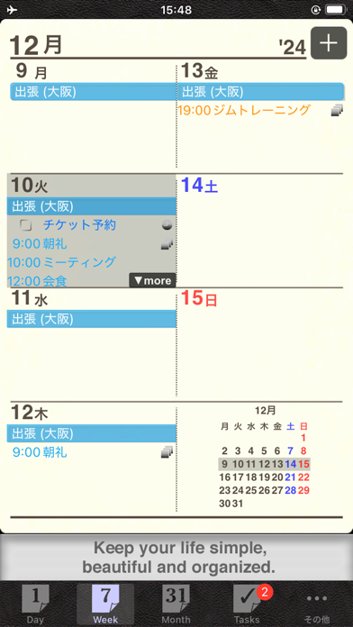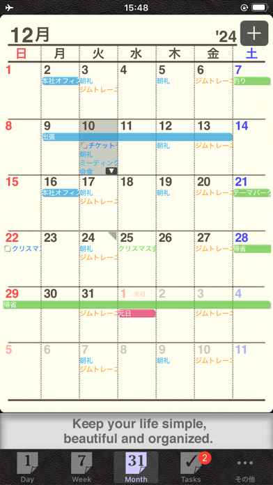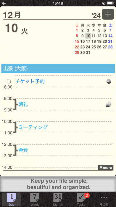 シンプルな機能で、スケジュールとタスクを一元管理できるアプリです。カレンダー表示は日・週・月の3種類。特に日表示が見やすく、時系列でスケジュールが書かれるので瞬時に予定を確認できます。クリーム色の背景と黒いラインの非常にシンプルな見た目は、毎日見ても飽きのこないデザインです。