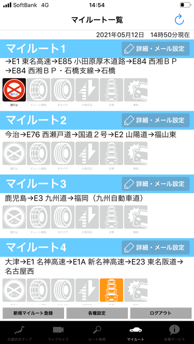 全国の高速道路の交通情報を取得できるアプリ。どこで渋滞が起きて通行止めが起きているのかがひと目でわかるため、走行ルートの選定に役立ちます。マイルートを設定しておけば、特定の区間のみの情報を瞬時に把握可能。ライブカメラで交通状況の確認もできます。
