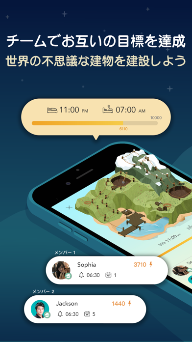指定した就寝・起床時間を守ると、アプリ内で建物が建設されます。夜ベッドに入る前にアプリを起動し、建物の工事をスタート。朝起床後に特定の動作を行い、建築を完了させるシステムです。