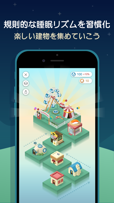 規則的な睡眠習慣で、自分だけの街を建設していく健康管理アプリ。設定した時間に起きられると建物を建設でき、設定した時間より遅くなると建設できなくなります。就寝前にスマホを使うと建物が壊れてしまうので要注意。健康的な睡眠習慣を作りたい人におすすめです。