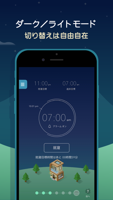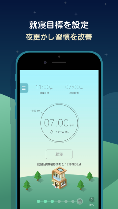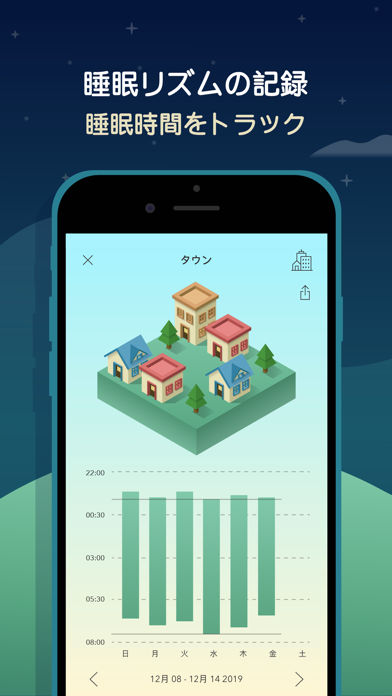 - 設定した目標時間に寝起きすると、街が発展するユニークなアラーム