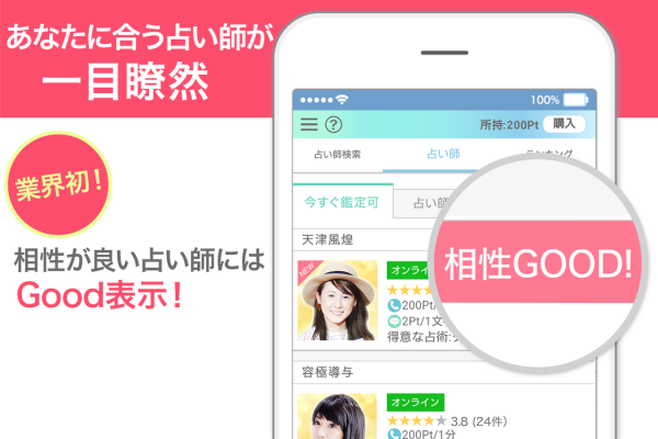 - アプリが相性ピッタリの占い師を紹介。的確なアドバイスを期待できる