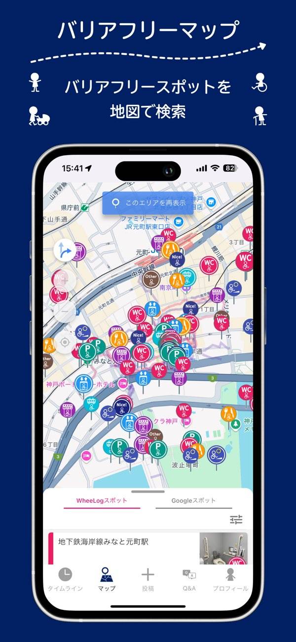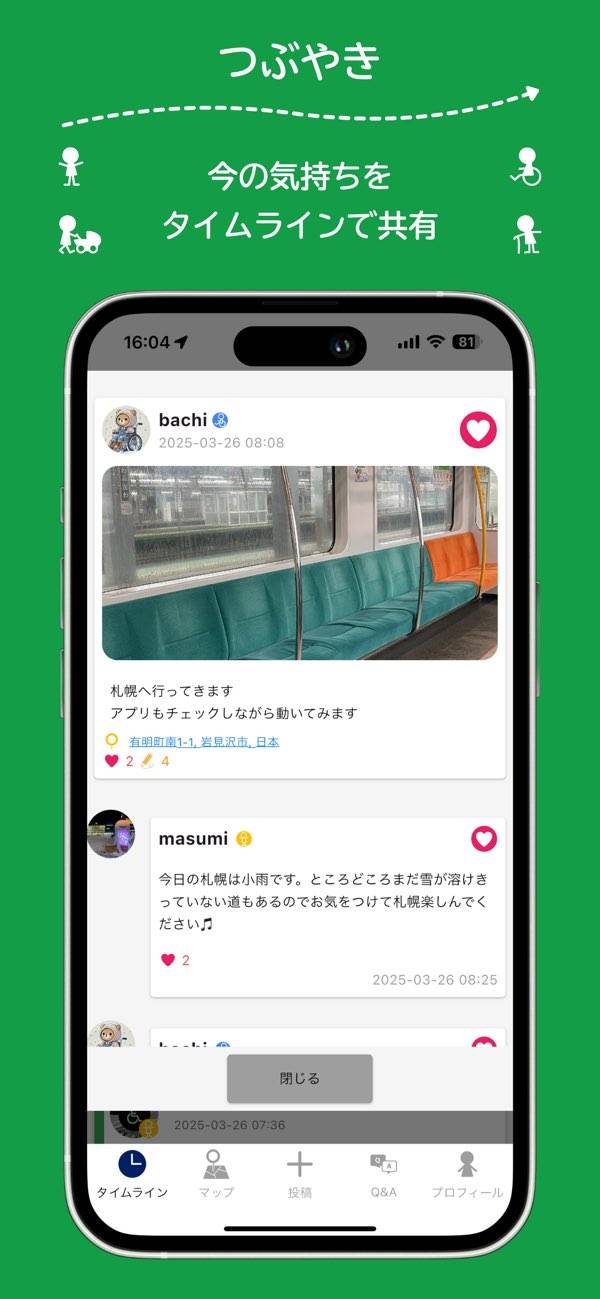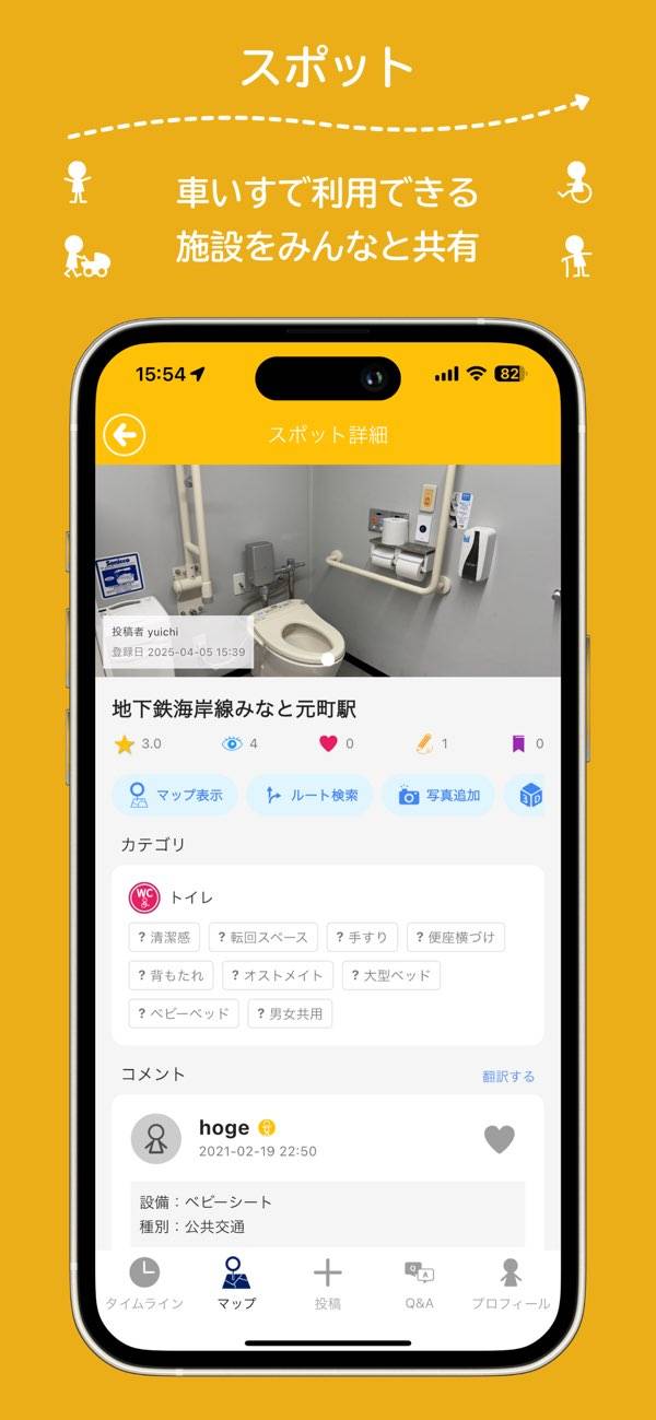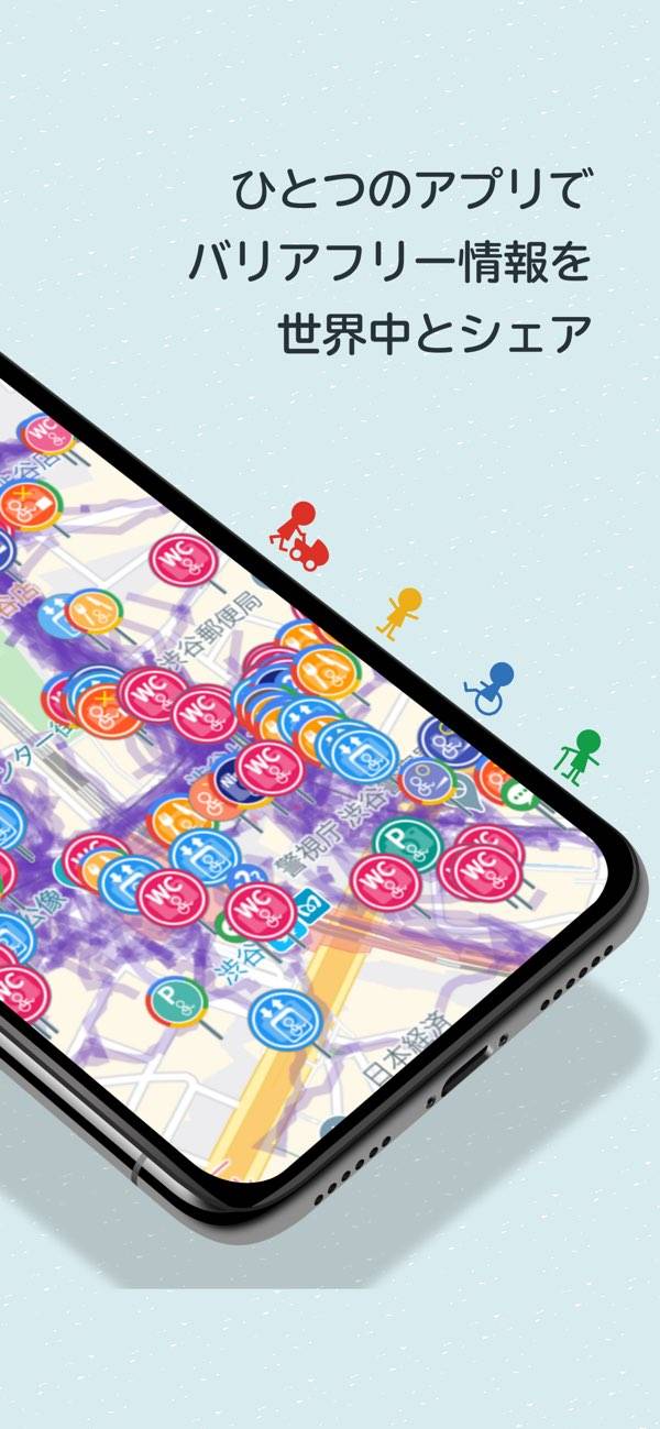 バリアフリー情報を共有するためのプラットフォーム。ユーザー同士が、バリアフリーの飲食店・トイレなどのスポットを投稿し合い確認できる仕組みです。