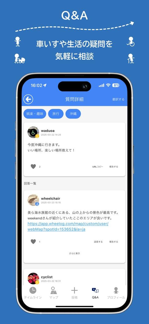 ユーザーが投稿した最新のバリアフリー情報をリアルタイムで閲覧できます。SNSのように、ほかのユーザーのつぶやきや投稿に対するコメント・写真も見られ、より詳細な情報を得ることが可能。事実にもとづいたリアルな情報を得られるのが魅力的です。