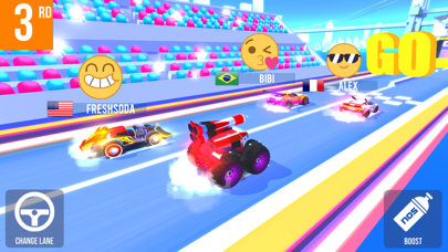 操作は「車線変更」と「ブースト」の2種類のみ。本格的なレースを求めている人には物足りないですが、簡単操作なので暇つぶしにはぴったり。車線変更で相手を付き飛ばしたり、ブーストで加速して敵を追い越したりと、ド派手なアクションで気分を盛り上げてくれます!