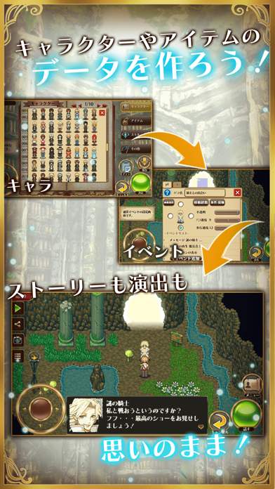 RPG好きなら一度は自分でRPGを作ってみたいと思ったことがあるはず。その夢を叶えてくれるのがこちら。プログラミング知識がなくても、簡単なタップ操作でオリジナルRPGを作れます。