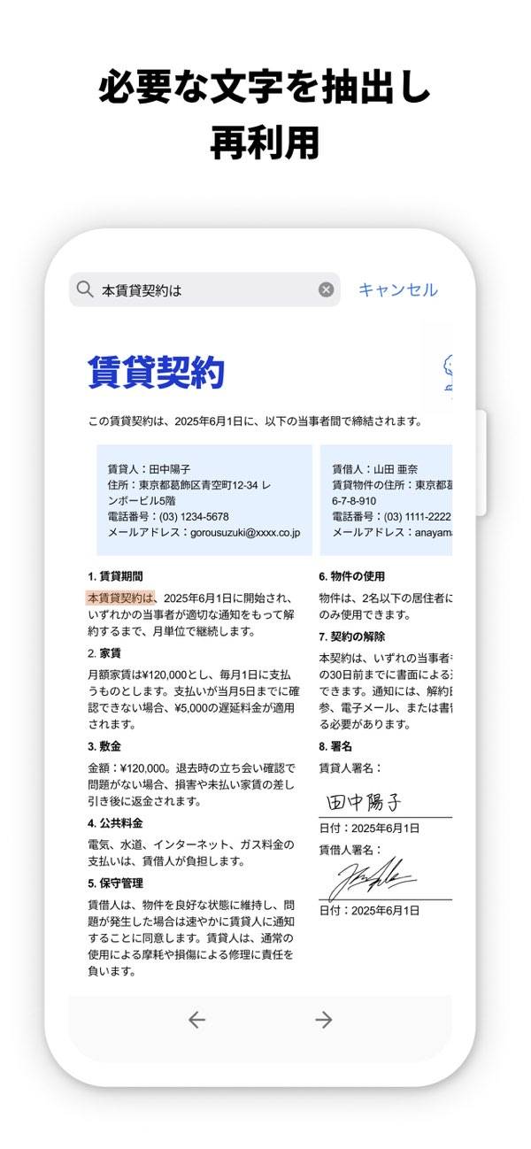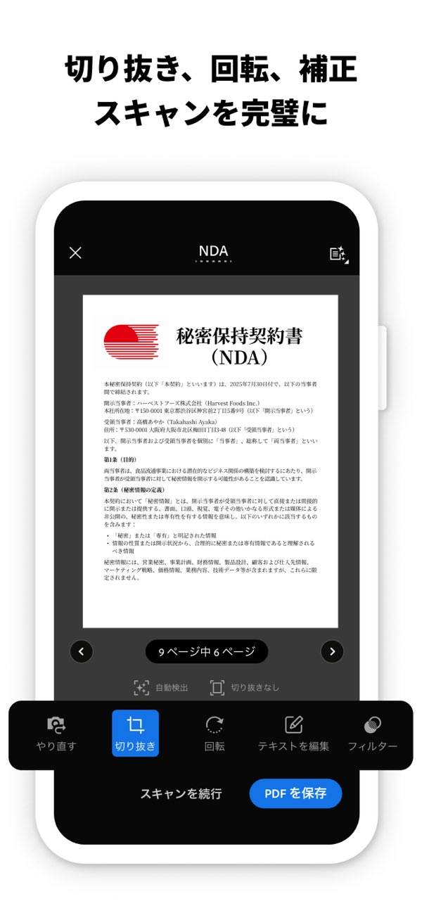 紙の文書を撮影してPDF化できる、Adobe社提供のスキャナアプリ。切り抜き範囲を指定して、好きな部分だけをPDFにして保存できます。紙と異なりたくさん保存してもかさばらず、共有も簡単に行えるのが魅力。精度にはムラがありますが、文字をテキストにして抽出することも可能です。