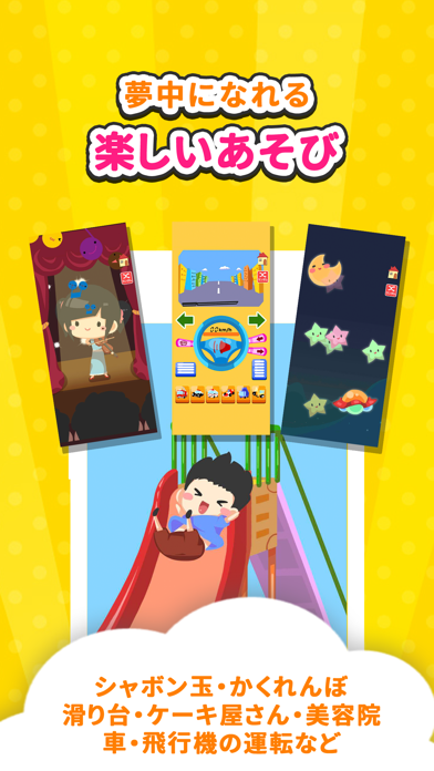 本作の基本操作はとてもシンプルで、画面をタッチするだけ。しゃぼん玉を割ったり、かくれんぼの動物を見つけたりと、小さな子供でも自然に楽しめる遊びが満載です。遊びの幅はとにかく広く、レストランごっこや車の運転、すべり台など子供が喜ぶ体験が多数搭載。毎回違う遊びを出してあげることで、飽きずに長く楽しめる点も魅力です。