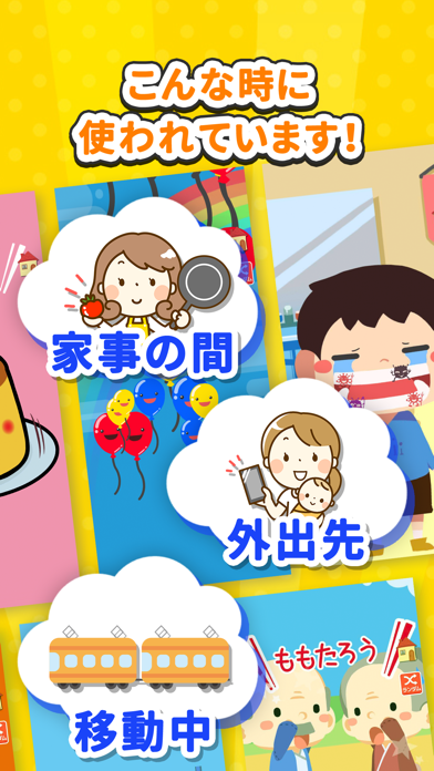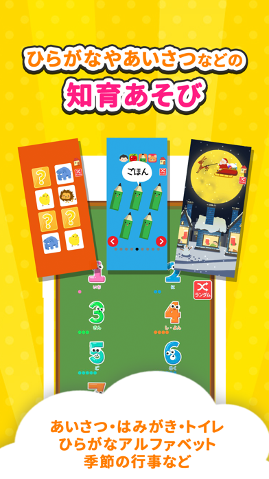 乳幼児向けの知育・しつけアプリゲームです。お風呂や歯みがきといった日常習慣から、ひらがな・数字といった就学前の学びまで、子どもが夢中になる200種類以上の遊びがそろっています。タッチだけの簡単操作なので、家事中や移動の合間でも安心して遊ばせられる、親子双方にうれしいアプリです。
