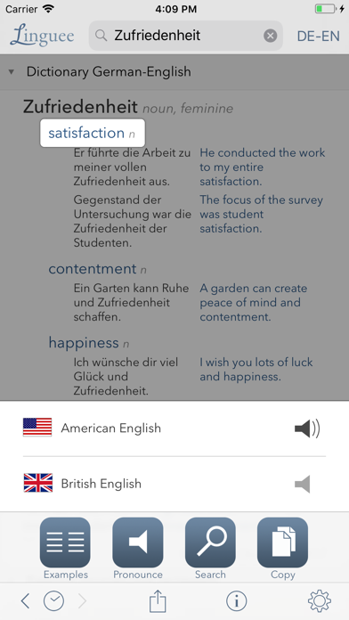 辞書内の単語をタップすると、発音を調べたり、意味を検索したりできます。その単語をより詳しく調べたいときにも便利。また発音はアメリカ式とイギリス式の両方が聴けるので、使う場面や相手に合わせて正しく覚えられます。