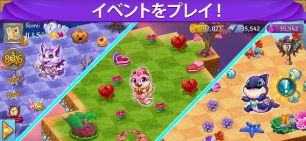 マージパズルのステージを進めていくとキャンプが開放。キャンプ地でもルールは変わらず、マージと浄化を繰り返していきます。フィールドの浄化が進むと新しいドラゴンとの出会いもあり。愛らしい旅のパートナーを集めていきましょう。