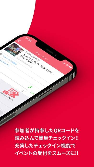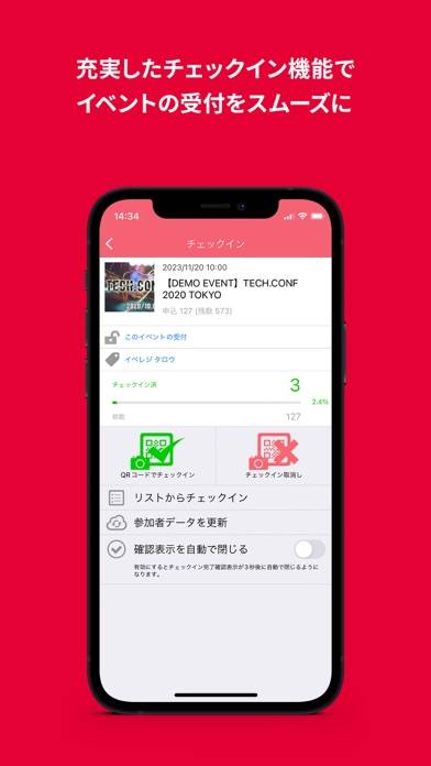 EventRegistで作成したイベントの運営・管理をスマホで行えるアプリです。QRコードによる参加者のチェックインや、参加者リストからの手動チェックインを行え、柔軟かつスムーズに受付対応できるようになるでしょう。